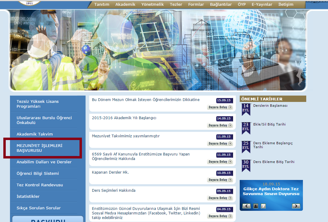 Enstitümüzden 2015-2016 Güz Döneminde (bu dönem) mezun olmak isteyen öğrencilerimiz; 25 Eylül 2015 tarihine kadar Mezuniyet İşlemlerini başlatmalıdır.