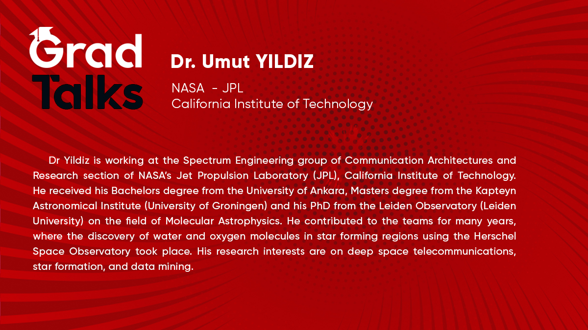 Enstitümüz tarafından düzenlenen "Grad Talks" serisinin üçüncü semineri 23 Aralık 2020 Çarşamba günü Saat 19.00'da zoom üzerinden yapılacaktır. Grad Talks Seminer Serisinin üçüncü konuğu California Institute of Technology-NASA Jet Propolsion Laboratuvarı Araştırma bölümünde görev yapan Dr. Umut Yıldız olacaktır. Detaylı bilgi aşağıda sunulmuştur. Konu ile ile ilgilenen tüm paydaşlarımız davetlidir.