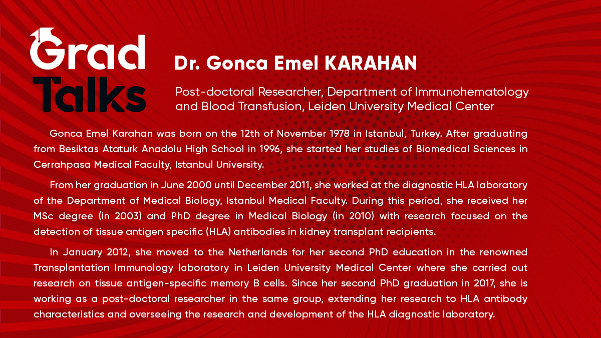 Enstitümüz tarafından düzenlenen "Grad Talks" serisinin dördüncü semineri 30 Aralık 2020 Çarşamba günü Saat 17.00'da zoom üzerinden yapılacaktır. Grad Talks Seminer Serisinin dördüncü konuğu Leiden University İmmünohematoloji ve Kan Nakli bölümünde doktora sonrası araştırmacı olarak görev yapan Dr. Gonca Emel Karahan olacaktır. Detaylı bilgi aşağıda sunulmuştur. Konu ile ile ilgilenen tüm paydaşlarımız davetlidir.