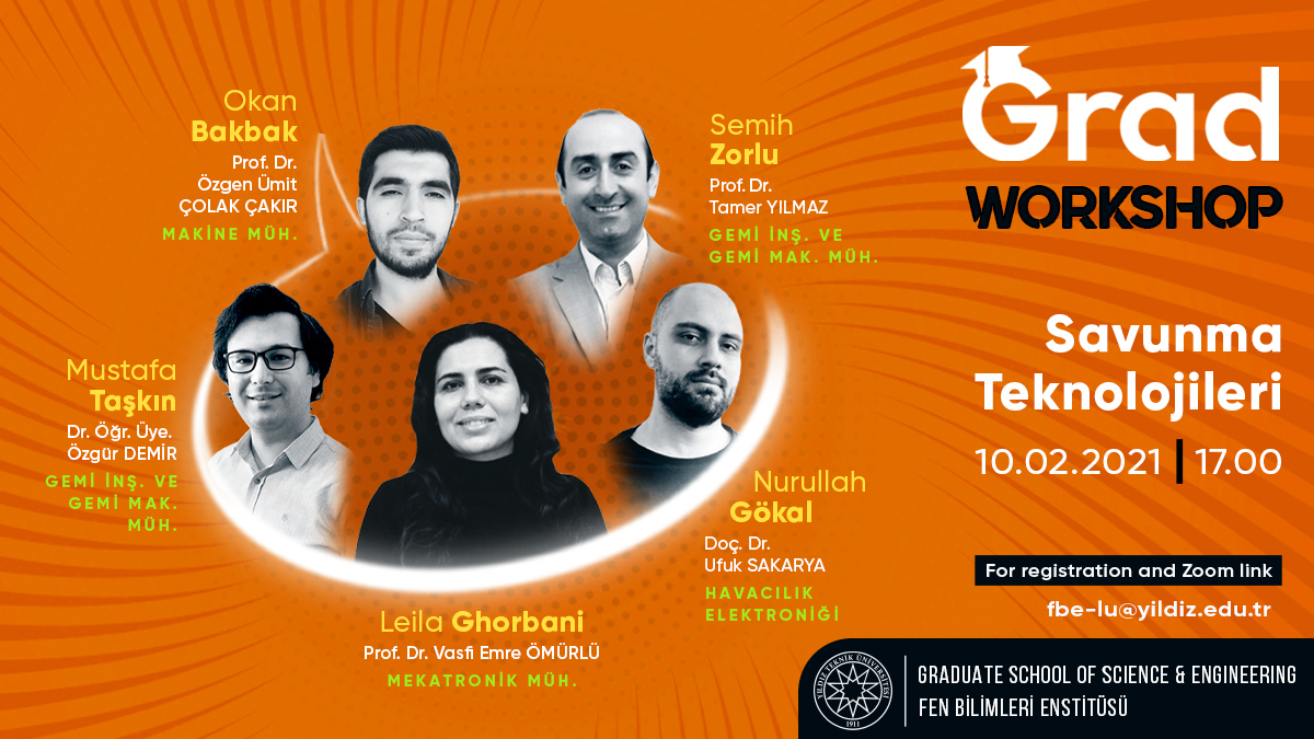 Enstitümüz tarafından düzenlenmekte olan lisansüstü öğrenci çalıştayı serisi "Grad-Workshop"un bu hafta gerçekleştirilecek olan dördüncü paneli ile devam edecektir. 10 Şubat Çarşamba günü Saat: 17.00'da başlayacak olan çalıştayda, beş lisansüstü öğrencimiz "Savunma Teknolojileri" alanındaki çalışmalarını sunacaktır. İlgili alanda çalışmaları takip etmek ve fikir alış verişi yapmak isteyen tüm katılımcılar davetlidir.