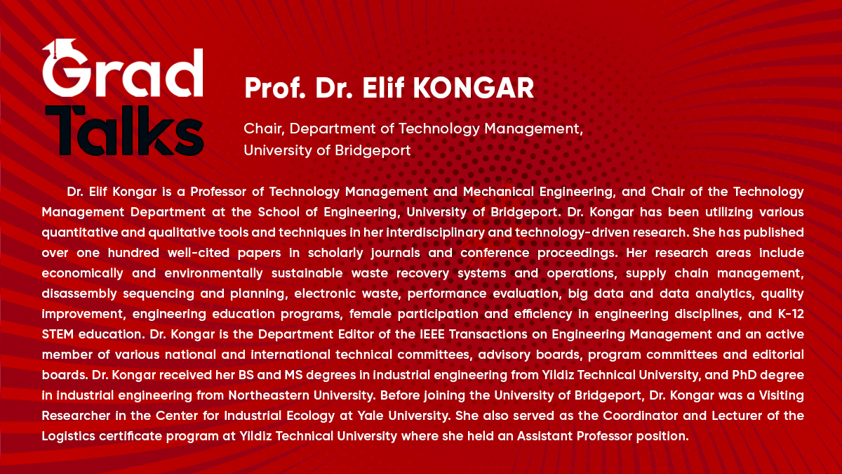 Enstitümüz tarafından düzenlenen "Grad Talks" serisinin altıncı semineri 08 Mart 2021 Pazartesi günü Saat 17.00'da zoom üzerinden yapılacaktır. Grad Talks Seminer Serisinin altıncı konuğu, Bridgeport Üniversitesi Teknoloji Yönetimi Bölümü Bölüm Başkanı, Prof. Dr. Elif KONGAR olacaktır. Detaylı bilgi aşağıda sunulmuştur. Konu ile ile ilgilenen tüm paydaşlarımız davetlidir.