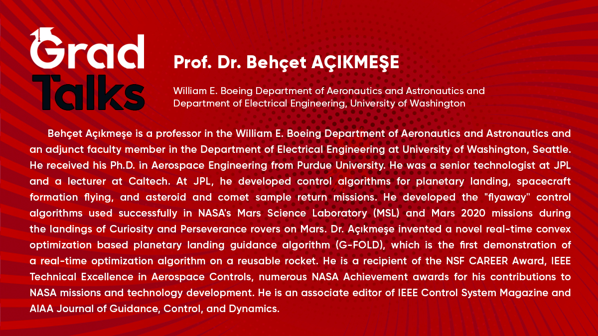 GradTalks Seminar Series' 10th session will be held over Zoom on April 28th, 2021, Wednesday. Our guest for the 10th session will be Prof. Dr. Behçet Açıkmeşe from the William E. Boeing Department of Aeronautics and Astronautics, and the Department of Electrical Engineering at University of Washington. We kindly invite you all who are interested in the topic.