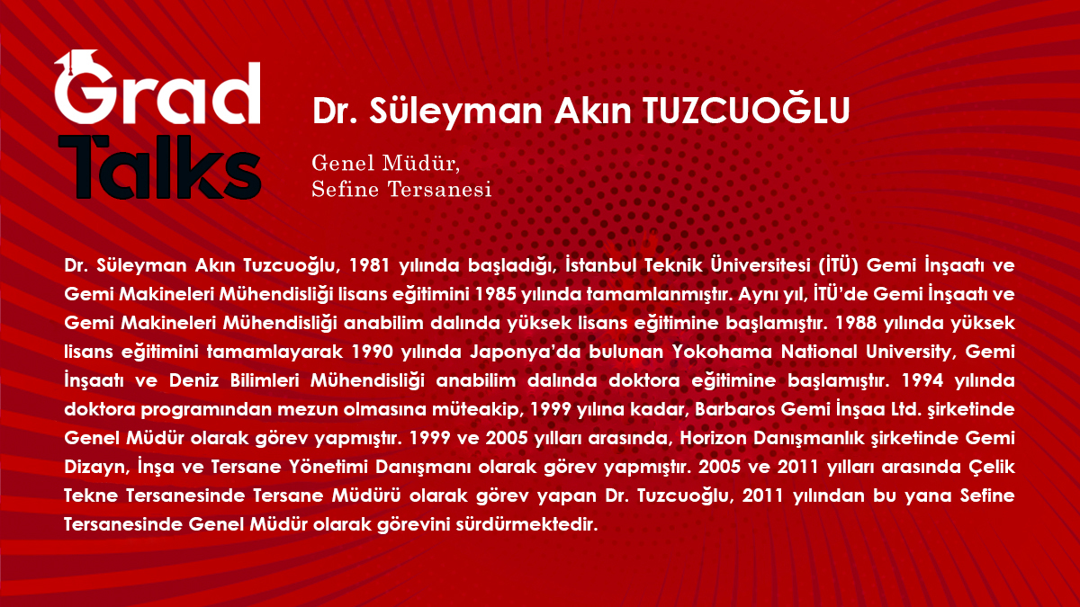 GradTalks Seminar Series' 11th session will be held over Zoom on May 18th, 2021, Tuesday. Our guest for the 11th session will be Dr. Süleyman Akın Tuzcuoğlu, who is the General Manager of Sefine Shipyard. During GradTalks XI, next week, we will be discussing the University-Shipyard Cooperation within the scope of ENTEZ program, jointly carried out by the Graduate School of Science and Engineering and Yildiz Technology Transfer Office. We kindly invite you all who are interested in the topic.