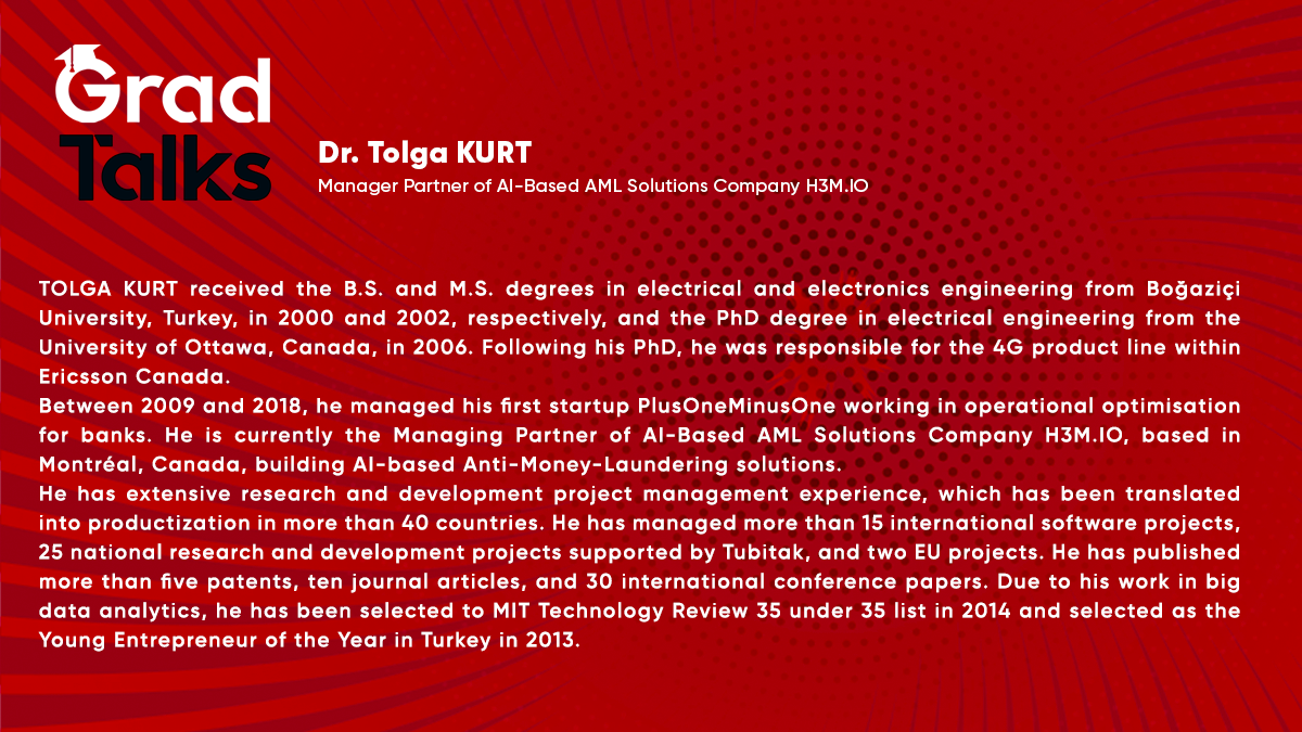 Enstitümüz tarafından düzenlenen "Grad Talks" serisinin on beşinci semineri 03 Kasım 2021 Çarşamba günü Saat 17.00'da Zoom üzerinden yapılacaktır. Grad Talks Seminer Serisinin on beşinci konuğu, Yapay zeka tabanlı kara para aklama karşıtı hizmetler sunan H3M şirketnin Yönetici Ortağı Dr. Tolga Kurt olacaktır. Detaylı bilgi aşağıda sunulmuştur. Konu ile ile ilgilenen tüm paydaşlarımız davetlidir.