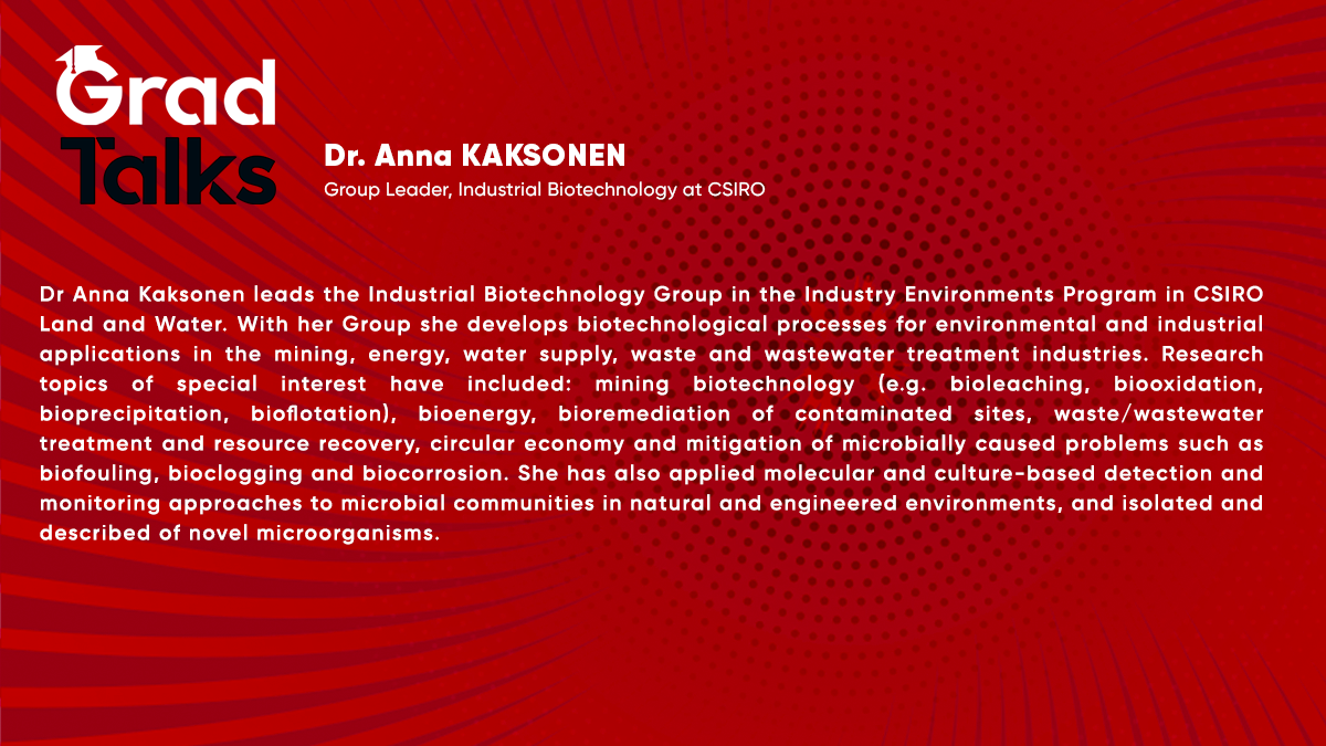 Enstitümüz tarafından düzenlenen "Grad Talks" serisinin on dokuzuncu semineri 01 Aralık 2021 Çarşamba günü Saat 17.00'da Zoom üzerinden yapılacaktır. Grad Talks Seminer Serisinin on dokuzuncu konuğu, CSIRO-Endüstriyel Bioteknoloji Grup Lideri, Dr. Anna Kaksonen olacaktır. Detaylı bilgi aşağıda sunulmuştur. Konu ile ile ilgilenen tüm paydaşlarımız davetlidir.