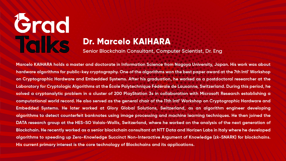 Enstitümüz tarafından düzenlenen "Grad Talks" serisinin yirmi birinci semineri 05 Ocak 2022 Çarşamba günü Saat 17.00'da Zoom üzerinden yapılacaktır. Grad Talks Seminer Serisinin yirmi birinci konuğu, Bilgisayar Bilimleri Uzmanı ve Blockchain Danışmanı olan Dr. Marcelo Kaihara olacaktır. Detaylı bilgi aşağıda sunulmuştur. Konu ile ile ilgilenen tüm paydaşlarımız davetlidir.