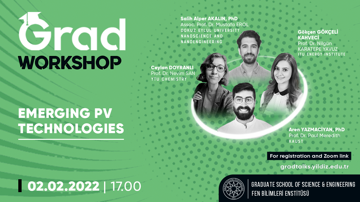 Enstitümüz tarafından düzenlenmekte olan lisansüstü öğrenci çalıştayı serisi "Grad-Workshop", bu hafta gerçekleştirilecek olan yedinci paneli ile devam edecektir. 02 Şubat Çarşamba günü Saat: 17.00'da başlayacak olan çalıştayda, dört araştırmacı "Yeni Nesil Fotovoltaik Teknolojiler" alanındaki çalışmalarını sunacaktır. İlgili alanda çalışmaları takip etmek ve fikir alışverişi yapmak isteyen tüm katılımcılar davetlidir.