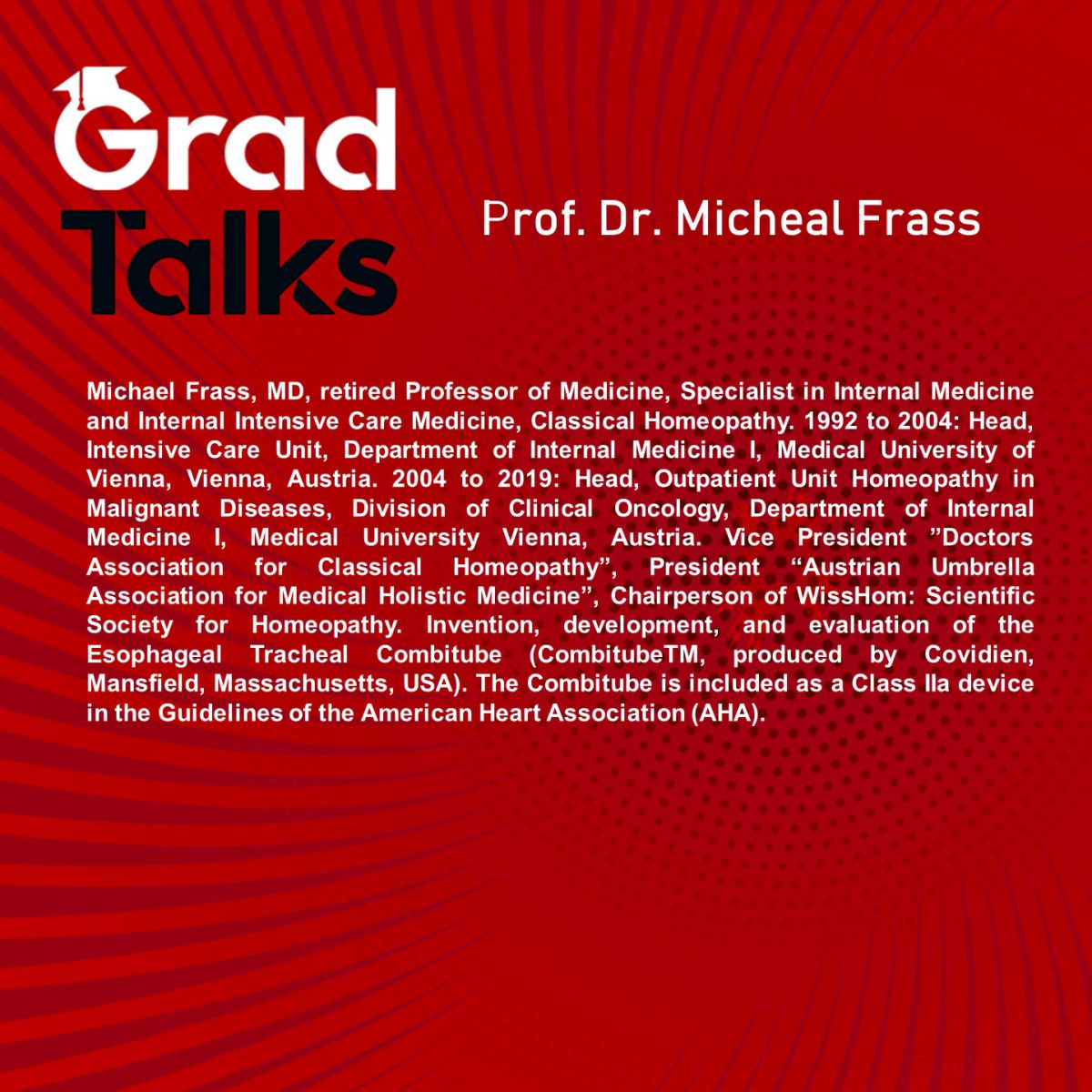 Enstitülerimiz tarafından düzenlenen "Grad Talks" serisinin kırk dördüncü semineri 29 Mayıs 2024 Çarşamba günü, saat 17:00’de Zoom üzerinden yapılacaktır. Grad Talks Seminer Serisinin kırk dördüncü konuğu, Medical University of Vienna'den Prof. Dr. Michael Frass olacaktır. Konu ile ilgilenen tüm paydaşlarımız davetlidir.